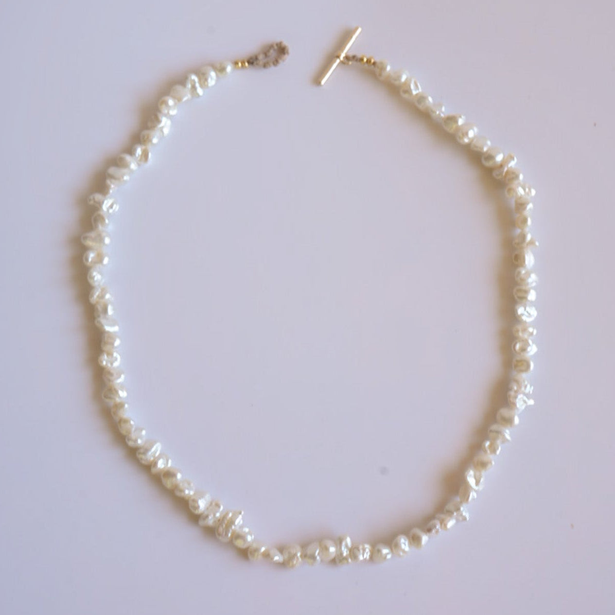 A delicate freshwater keshi pearl 16 inch necklace, full of youthful charm. Each pearl is white and naturally formed, with unique shapes and sizes that make every piece one of a kind. The keshis are strung in a flowing sequence, their organic irregularity creating a playful yet elegant look. Light reflects gently across their soft luster, giving the necklace a fresh, radiant feel — perfect for adding an effortless touch of individuality to any style.