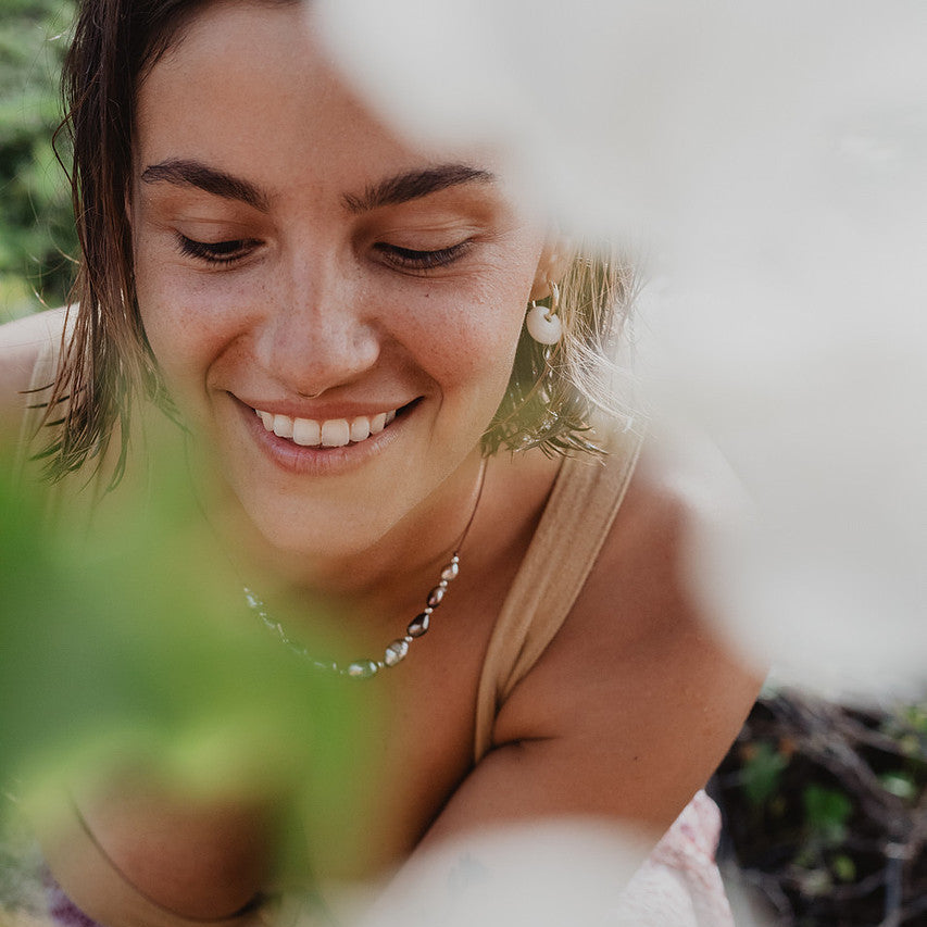 This necklace is strung with nine Tahitian Keshi pearls, each one with its own beautiful, organic shape. The pearls show off deep peacock and dark tones that shimmer with different colors in the light. It’s that natural luxe that only Tahitian pearls have. Between each pearl I added a small silver bead to give it a touch of brightness and balance. The strand is finished on a silky cord, and you can choose between 16, 18, or 20 inches depending on how you like it to sit.